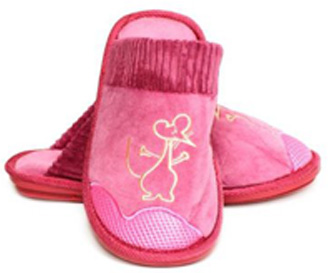 Симпатичные тапочки, украшенные вышивкой в виде мышки. Модель оформлена рисунком в полоску. Комфортная и уютная обувь для домашнего отдыха.